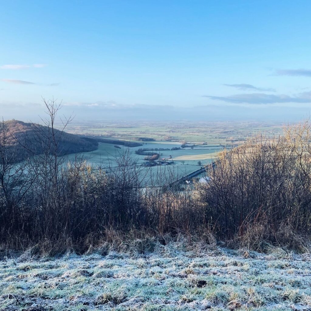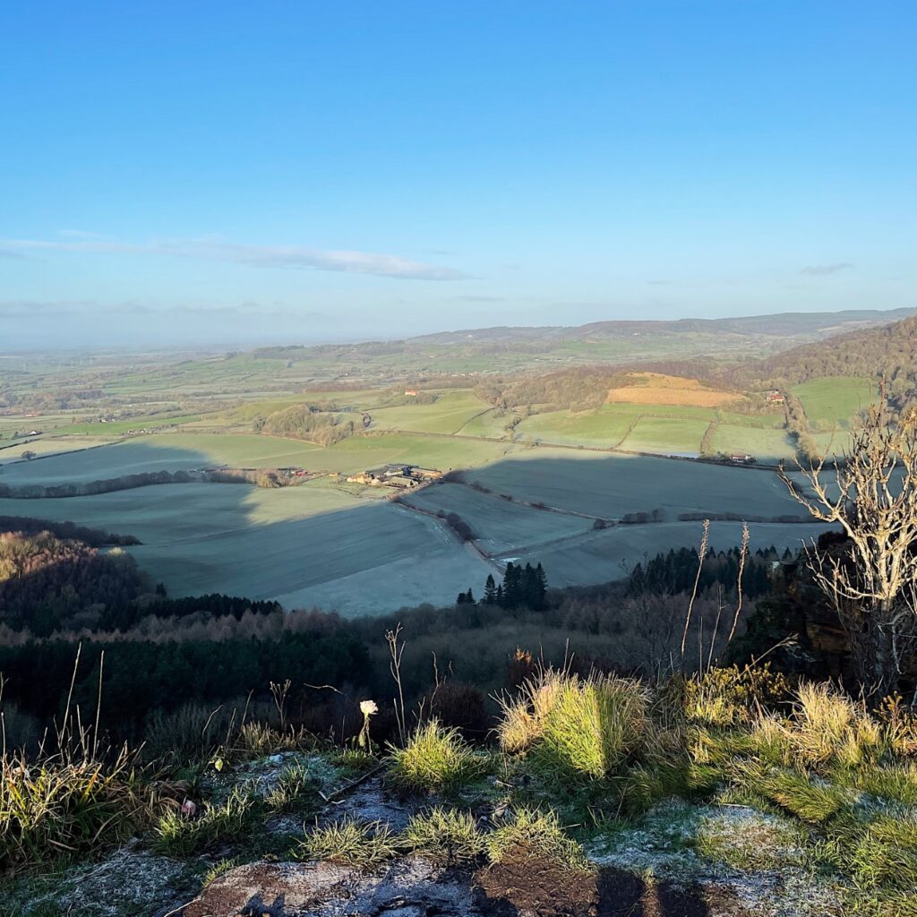 Despite being able to see Sutton Bank and the white horse from the village I grew up in, I’ve never actually been up there for a rake about. My husband and I have discussed going up there many times but it took my thirtieth birthday to actually get us there. We got up nice and early to beat the rush which was a wonderful idea as we were greeted by cold blue skies, a soft winter sun and the grass and hills were sparkling with frost.